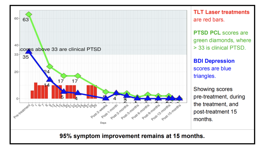 treatment. Some patients achieve 100% reduction in depression, PTSD, suicidal thoughts, and nightmares. Patients report less brain fog and improved employment outlook. Results point to a durable effect of 1+ year following 10-15 treatments over a 3 week span, with 70% of patients reporting improvement.